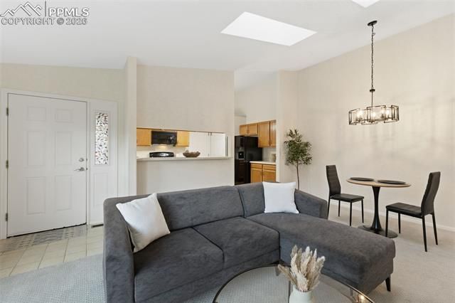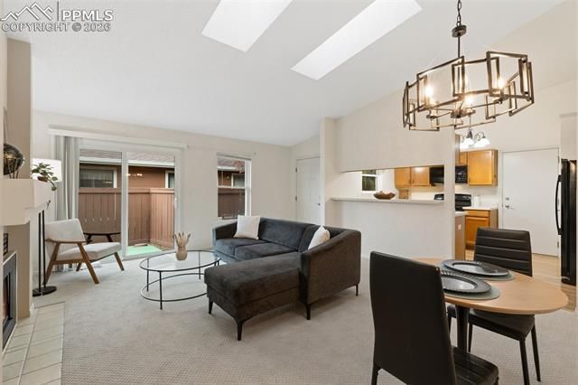Welcome to easy, low-maintenance living in the highly sought-after Village at Skyline, one of Colorado Springs’ premier 55+ communities. This desirable Paul Revere-style duplex offers 2 bedrooms, 2 bathrooms, and approximately 992 square feet of thoughtfully designed living space. Inside, you’ll find fresh new carpet and a bright, inviting layout highlighted by skylights that fill the home with natural light. The upgraded gas fireplace creates a warm and comfortable focal point in the living area, perfect for relaxing evenings. The kitchen is fully equipped, including a built-in microwave, and has been optimized for functionality with the washer and dryer relocated to the heated, finished garage—allowing for additional pantry and storage space. Enjoy beautiful views from your private back deck, ideal for morning coffee or quiet afternoons. Pet owners will appreciate the convenience of two dog doors, providing easy access to both the deck and side patio for a small dog. The home also includes air conditioning and an emergency call system for added peace of mind. Utilities have averaged approximately $140 per month over the past year. The lifestyle at Village at Skyline is truly unmatched. Association services are included in the monthly cost, covering exterior maintenance, snow removal, trash service, and more. Residents enjoy access to free basic cable, scheduled transportation, planned activities, health and wellness programs, libraries, a computer center, indoor pool access, and a billiards center, all within a gated community with security. Additional dining services are also available for added convenience. This home truly offers exceptional value in a vibrant, amenity-rich community designed for comfort, convenience, and connection.