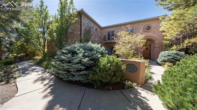 Welcome to 4896 Stonehill, where Old World artisanship meets modern luxury. This extraordinary residence showcases antique architectural treasures and custom features throughout.A hand-carved stone door surround frames the oversized entrance, complemented by gas copper lighting and a stone wall fountain. The flagstone patio and walled garden create a private sanctuary.Soaring 10-21 foot ceilings grace the first floor, with 9-foot ceilings upstairs. Travertine flooring with radiant heating, oversized 8-foot doors, and authentic Venetian plaster installed by artisans from Venice, define the interior. The foyer features hand-carved railing and ironwork from France with custom Tibetan carpeting. The living room showcases a hand-carved limestone fireplace and antique Chinese Compound doors concealing a wet bar, The family room offers hand-hewn wood ceilings.The chef's kitchen includes custom inset cabinets, marble-topped table, and granite countertops with Pikes Peak views. The outdoor patio features a built-in cooking center with gas grill and stone countertops.The service area includes a dog room with plumbing connected to an outdoor run, coat closet, and gift wrapping center.Upstairs, the primary suite opens to a balcony with waterfall and Pikes Peak views. The spa bathroom includes radiant heat and hidden TV. The custom maple closet features 46 drawers with in-closet laundry, connecting to a workout room.Two guest suites offer Juliet balconies and ensuite baths. One features a vanity from antique French railing with freestanding tub.The theater room provides tiered seating and projection system behind an antique Moroccan door. An additional bonus/craft room is located upstairs. It can easily be converted to an additional bedroom. The wine cellar houses racking for over 500 bottles.The lot is amazing. It is private and backs to open space with direct views of Pikes Peak. 4896 Stonehill Road represents unprecedented craftsmanship—not just a home, but a work of art.